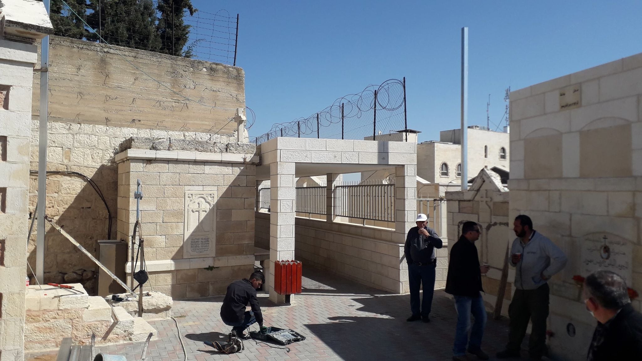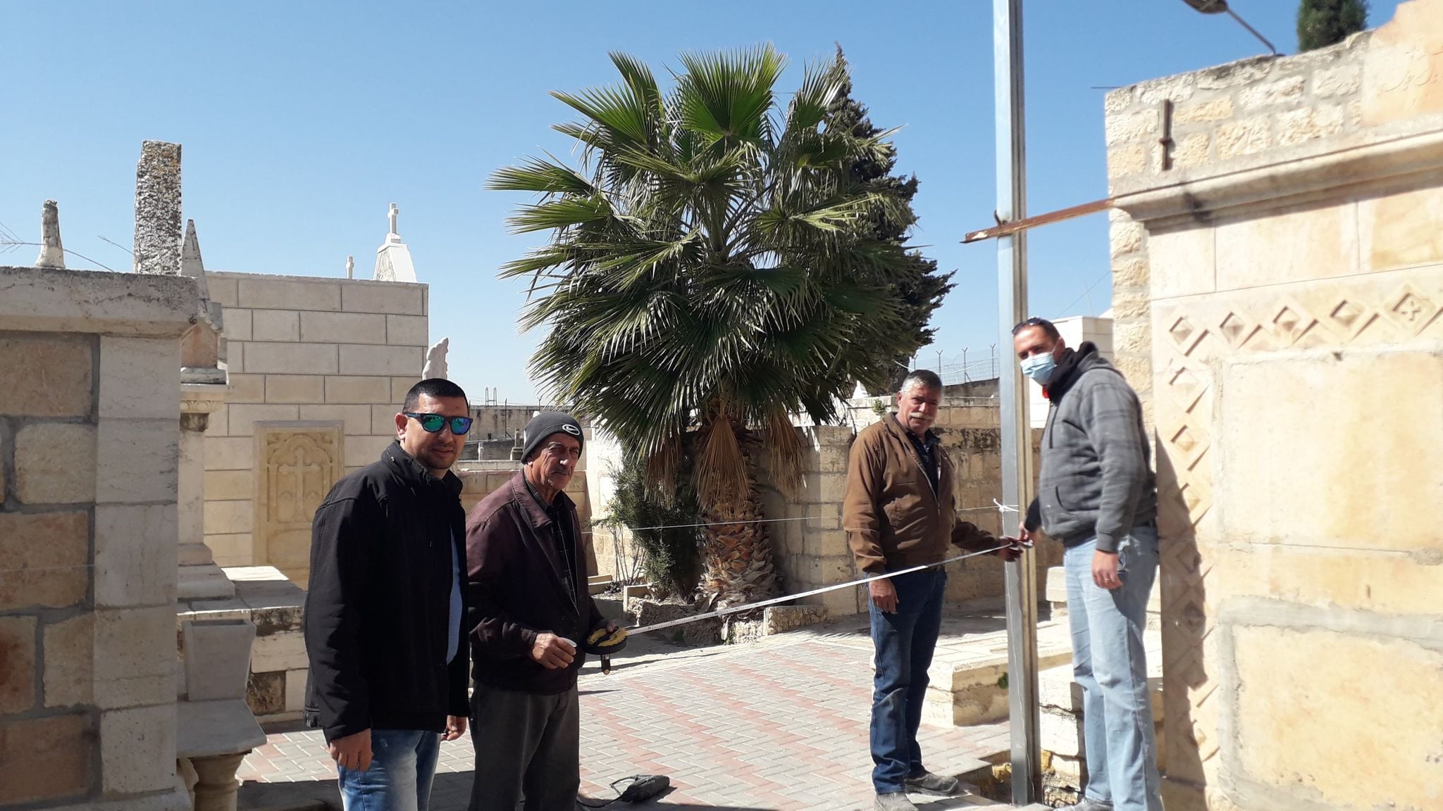 مظلة في الساحة الرئيسية أمام المدخل الرئيسي لمقبرة الطائفة “بمساحة تقارب 110متر مربعاً”